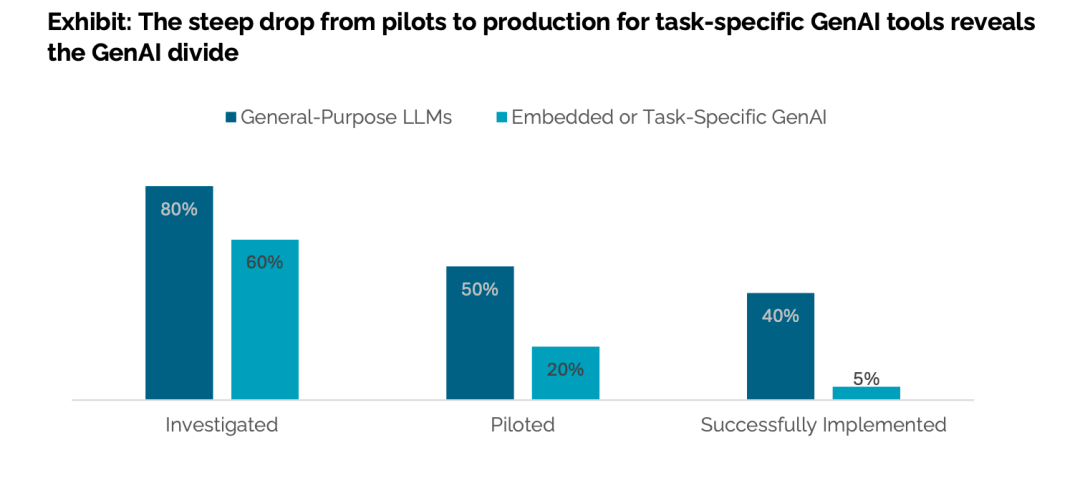 MIT's data also challenges conventional wisdom regarding 'general-purpose' versus 'specialized' AI. Initially, 60% of companies considered task-specific generative AI, but this figure plummeted to just 5% during implementation. In contrast, general-purpose large language models demonstrated far greater resilience.