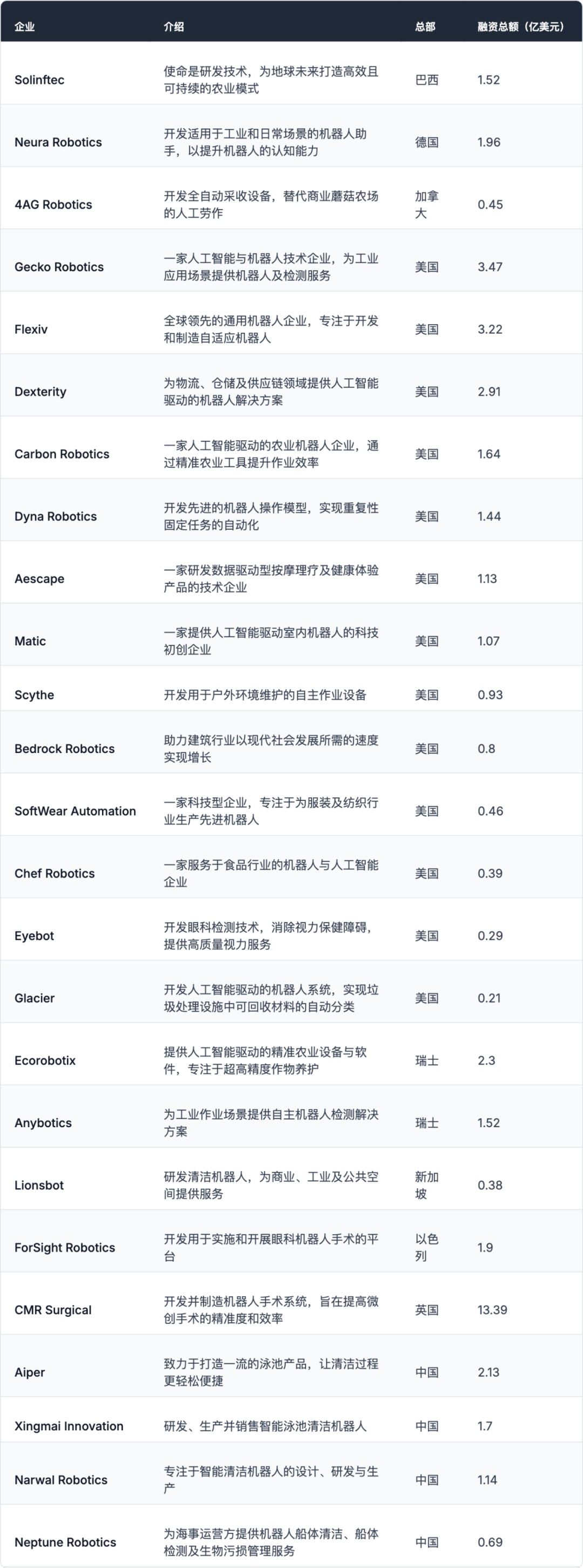 ● In China, cleaning robots remain a focal point. Companies like Aiper, Xingmai Innovation, Yunwhale, and Neptune Robotics are developing intelligent cleaning or underwater robots, with total financing surpassing $500 million, highlighting China's strong competitiveness in life service and specialty robot sectors.