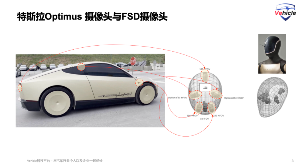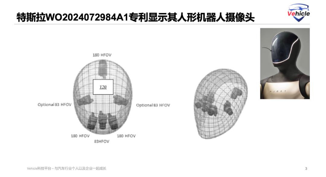 In fact, such a camera configuration appears to be quite logical. The two cameras positioned at 30 degrees and 120 degrees directly in front of Tesla's vehicles are primarily designed for long-distance visibility. However, since humanoid robots typically move at relatively slower speeds compared to cars, there is no necessity for these two cameras on humanoid robots. The side-facing cameras are sufficient to ensure 360-degree visual coverage for the robot.
