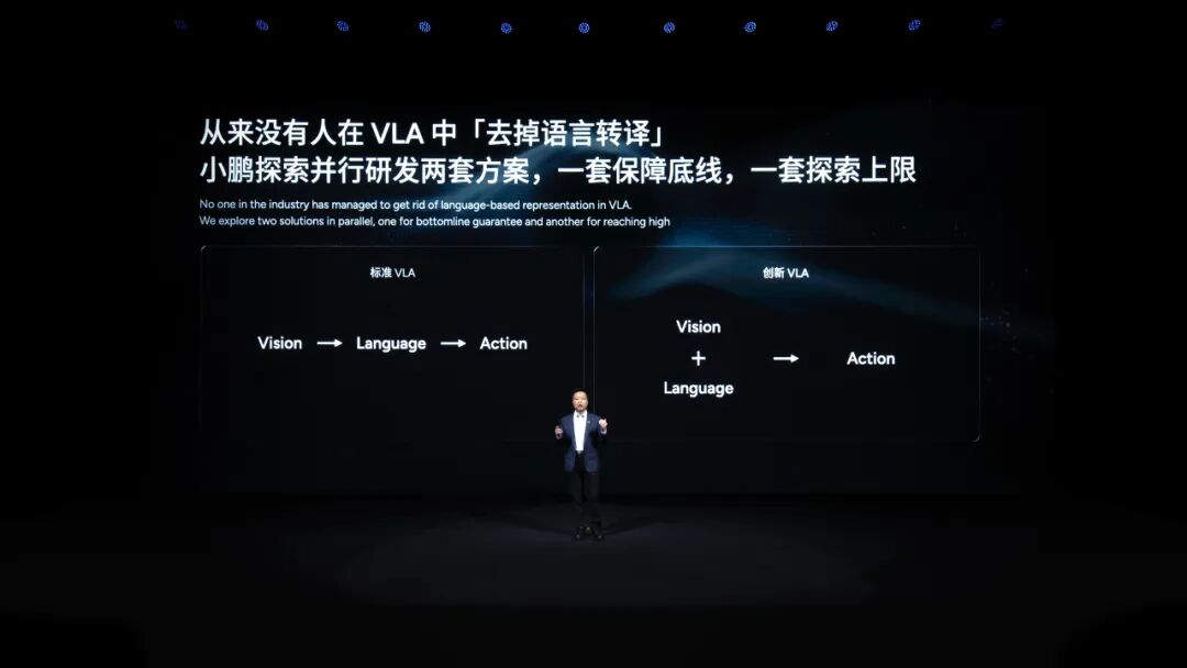 At XPENG Tech Day, He Xiaopeng explained that XPENG has been developing two VLA solutions in parallel: a standard version already deployed in vehicles (Vision-to-Language-to-Action).