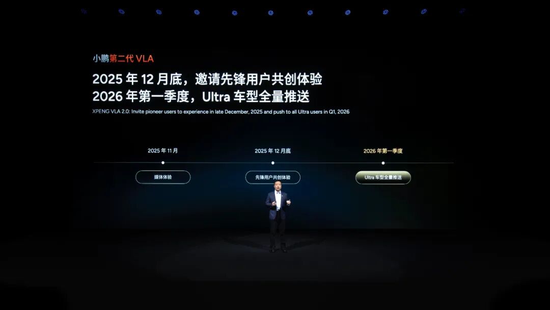 XPENG's vehicle deployment timeline is small-scale experiences in November-December 2025, with Ultra model users receiving updates in 2026.