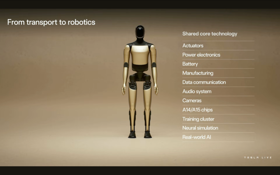 Musk stated that Tesla is already the world's largest robot manufacturer, as each vehicle is a four-wheeled robot. Tesla possesses all the foundational elements required for robot manufacturing: batteries, power electronics, motors, gearboxes, visual AI, AI chips, and software. This is indeed true.