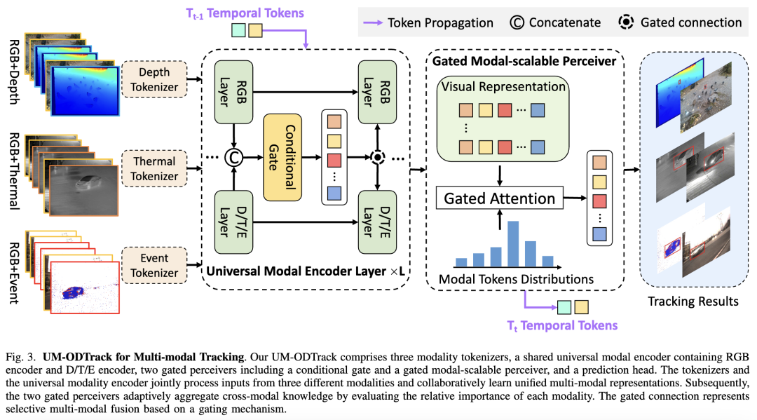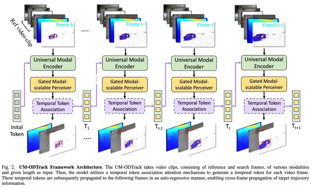 Figures 2 and 3 below provide an overview of the UM-ODTrack framework for video-level multimodal tracking. The entire video is modeled as a continuous sequence, and the localization of target instances is decoded frame by frame in an autoregressive manner. First, a novel video sequence sampling strategy is proposed, specifically designed to meet the input requirements of video-level models (Principle 1: Video-Level Sampling). Then, a novel modality tokenizer is proposed to tokenize different modality sources in a shared encoding manner. Subsequently, to capture the spatio-temporal trajectory information of target instances in video sequences, two simple yet effective temporal token association attention mechanisms are introduced (Principle 2: Video-Level Association). In addition, two powerful gated perceivers are introduced to adaptively learn universal visual representations across modalities, thereby improving the model's generalization ability in different tracking scenarios (Principle 3: Modality Scalability).