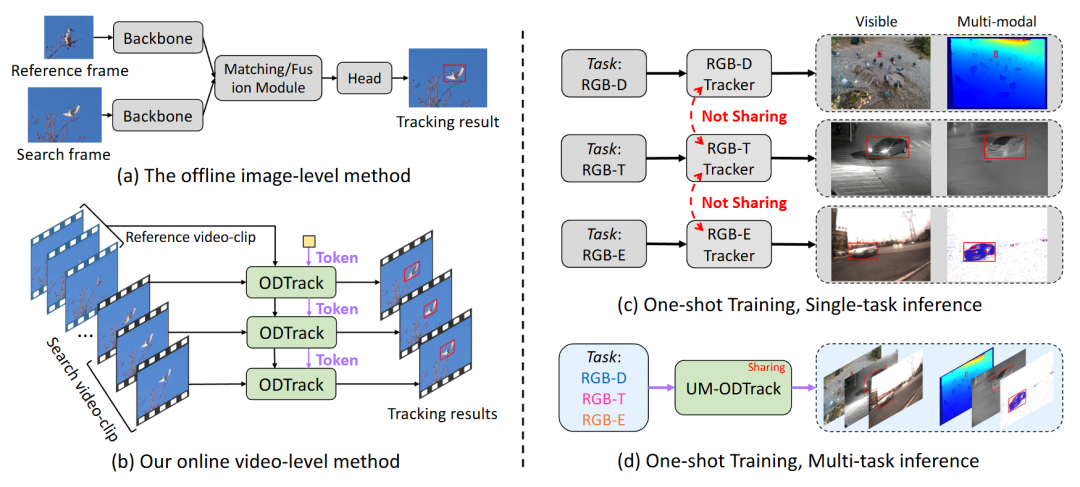 Figure 1. Comparison of Tracking Methods. (a) Offline image-level tracking method based on sparse sampling and image pair matching. (b) Online video-level tracking method based on video sequence sampling and temporal token propagation. (c) Multimodal tracking method based on single-training and single-task inference (i.e., one model for one task, one-to-one) [62], [64]-[66]. (d) Universal modality perception tracking model based on single-training and multi-task inference (i.e., one model for multiple tasks, one-to-many).