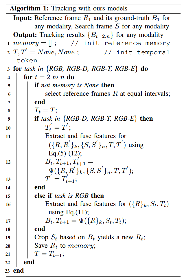 Universal Inference. Algorithm 1 summarizes the inference process of our model. For RGB tracking, we follow the same tracking procedure as other transformer trackers. Benefiting from our one-shot training scheme and gated modality-extensible perceptron module, for RGB-D, RGB-T, and RGB-E tracking tasks, we seamlessly perform inference for any tracking task using the same set of model parameters without the need for additional multiple fine-tuning techniques. In terms of input data, to maintain consistency with the training setup, we incorporate three equally spaced reference frames into our tracker during the inference phase. Meanwhile, the search frames and temporal token vectors are input frame by frame.