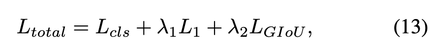 Specifically, focal loss is adopted as the classification loss , and L1 loss and GIoU loss are used as the regression losses. The total loss can be formulated as: