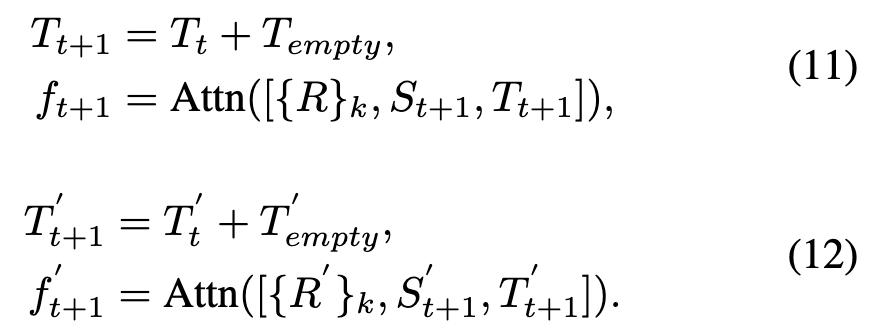 Once the target information is extracted by the temporal tokens, the token vectors are propagated from the i-th frame to the j-th frame in an autoregressive manner, as shown in Figure 4 (right). First, the temporal token of the i-th frame is added to the empty token of the j-th frame, yielding the updated content token of the j-th frame, which is subsequently propagated as input to subsequent frames. Formally, the propagation processes for visible and multimodal tracking are: