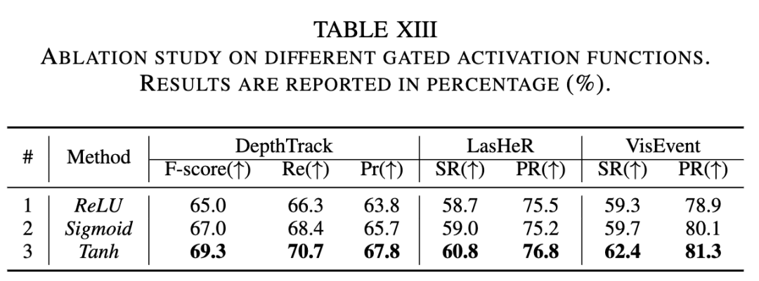 Effectiveness of Gated Perceptron and Gated Activation Function. We conducted experiments to verify the effectiveness of the two proposed components, namely conditional gating and the gated modality scalable perceptron (GMP), under the universal modality-aware tracking framework, as shown in Table X below. The baseline method refers to the dual-stream version of ODTrack. By adding the conditional gating module to the baseline, the performance of our tracker improved on three downstream tracking datasets. For example, the tracker equipped with conditional gating achieved a 1.3% improvement in the F-score metric on the DepthTrack benchmark. Additionally, by incorporating GMP into our model, its performance further improved. This proves the effectiveness of our two proposed gating modules. Furthermore, to investigate the effect of the gated activation function, experiments were conducted using different gated activation functions in Table XIII. Compared to ReLU and sigmoid, the tanh activation function performed the best. This result indicates that the tanh gating function is more suitable for learning and representing universal multimodal tracking tasks in our gated perceptron, potentially providing better generalization capabilities.