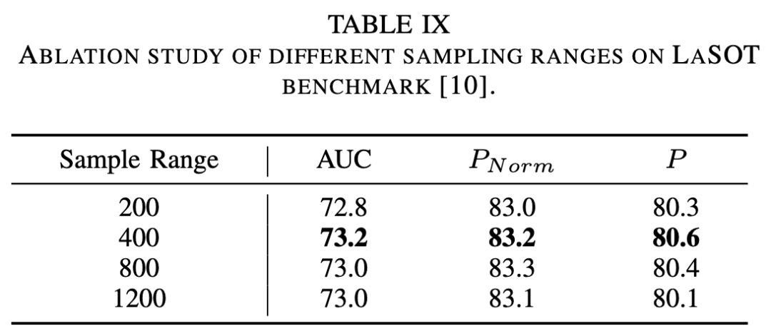 Sampling Range. To verify the impact of the sampling range on algorithm performance, experiments were conducted on the sampling range of video frames, as shown in Table IX below. When the sampling range expanded from 200 to 1200, there was a significant improvement in the performance of the AUC metric, indicating that the video-level framework can learn target trajectory information from a larger sampling range.