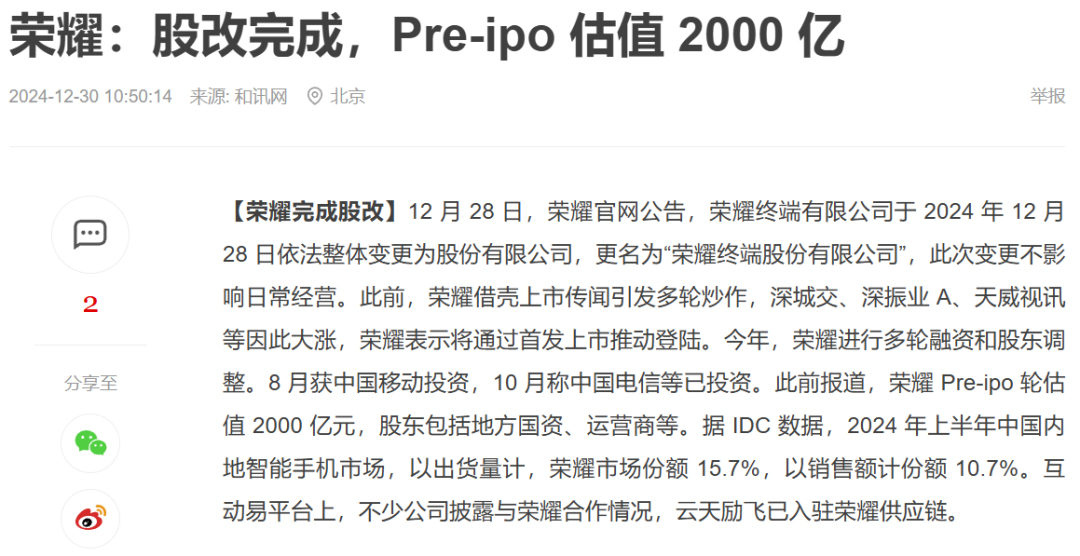 During its pre-IPO funding round, Honor’s valuation of ~200 billion yuan marked a 23% decline from its Huawei split valuation (260 billion yuan), reflecting investor caution.