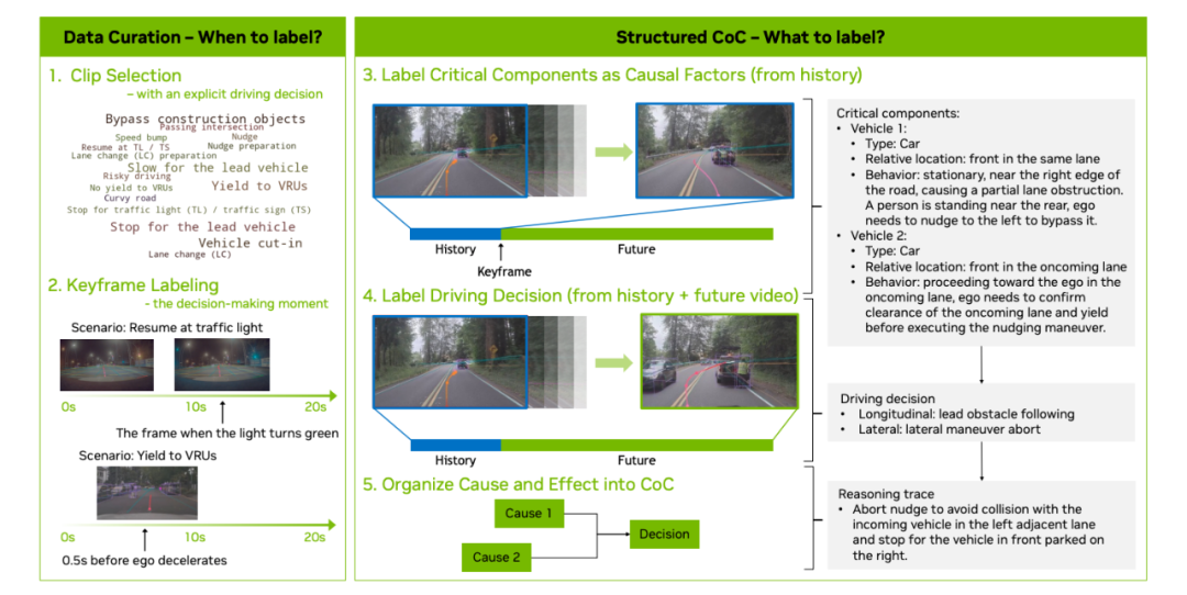 However, before annotation, it must be determined when to mark these reasoning data. Not every video clip is worth annotating; annotation is triggered only at moments when a clear causal link can be established between observable factors and the vehicle's subsequent decisions. Therefore, data management is a critical aspect of the data annotation framework, involving the identification of these key reasoning moments.
