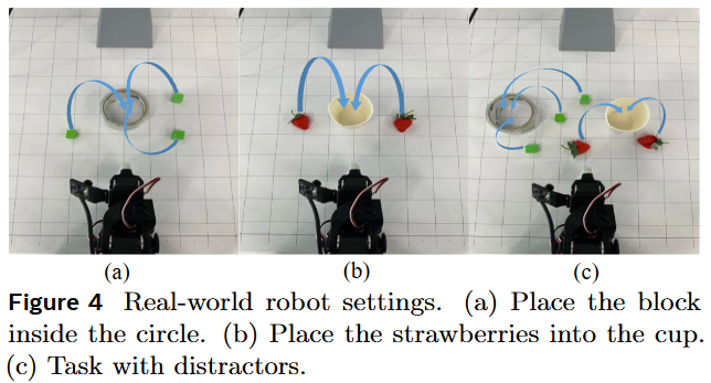 A trial is considered successful if the robot places at least one target object into the designated position within a predefined time budget. A trial fails if any of the following occur: (1) Exceeding the time limit; (2) The robot accumulates more than five consecutive failed grasping attempts on a single target; (3) In the instruction-following with distractors setting, the agent attempts to manipulate any distractor object. Each task is tested 10 times, and this work reports the success rate.