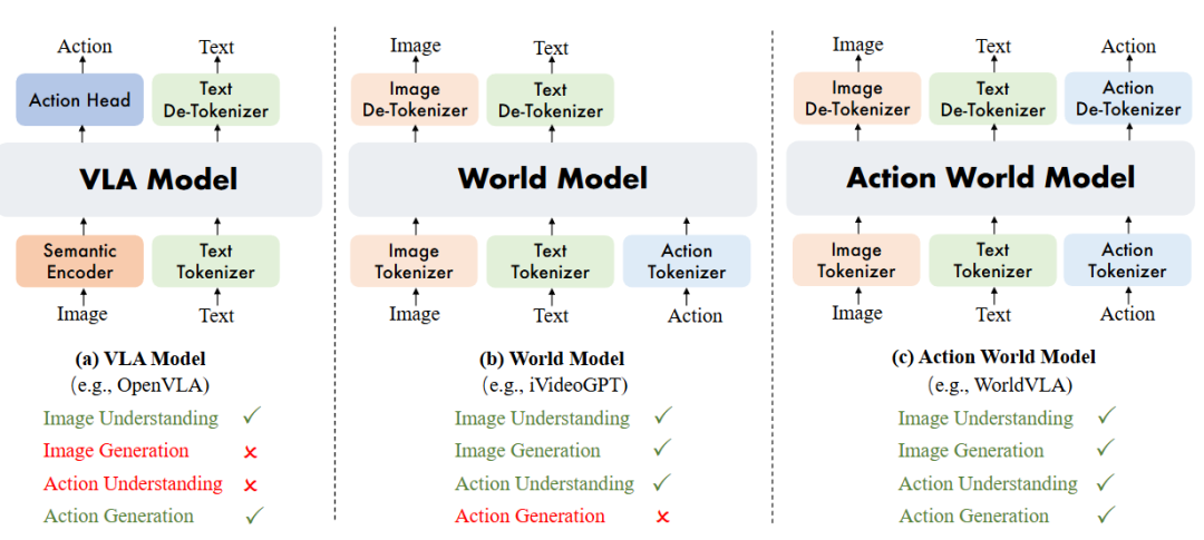 Figure 1(a) VLA models generate actions based on image understanding; (b) World models generate images based on image and action understanding; (c) Action world models unify image and action understanding with generation.
