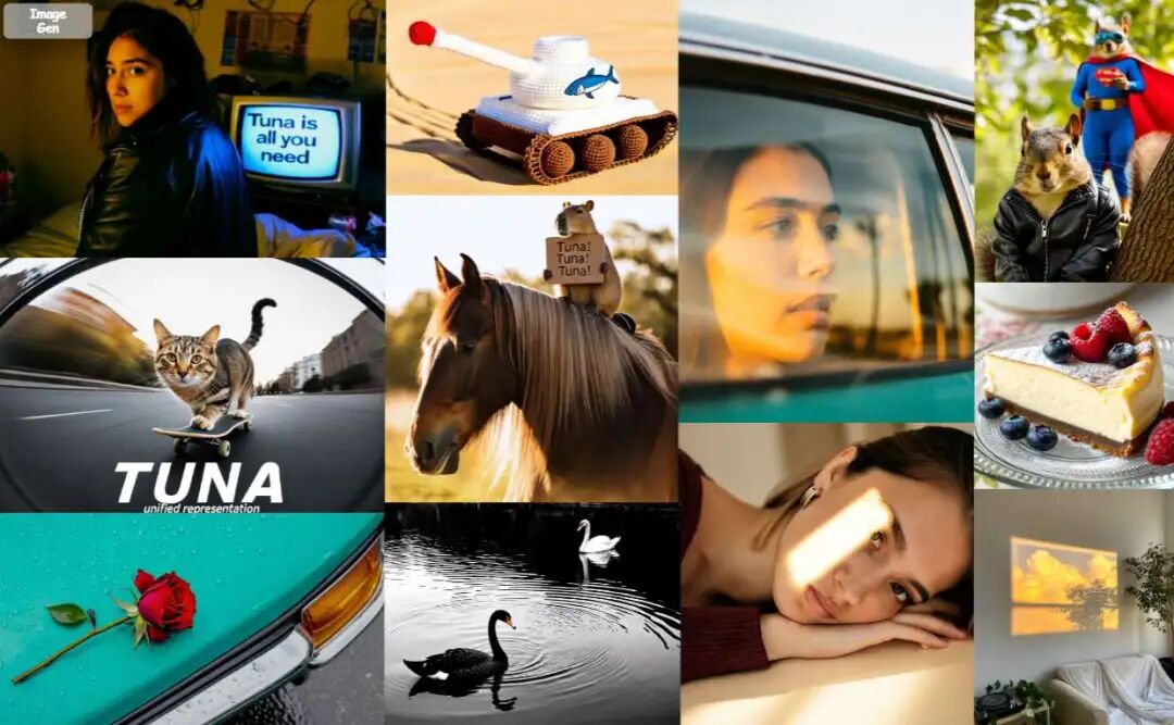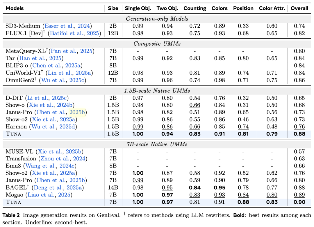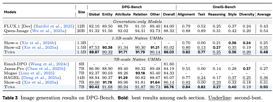 Image Generation Tuna is evaluated on three benchmarks: GenEval, DPG-Bench, and OneIG-Bench. The results are shown in Table 2 and Table 3 below. Tuna consistently outperforms existing methods, including Janus-Pro, BAGEL, and Mogao. Particularly in OneIG-Bench, Tuna demonstrates significant advantages in text rendering quality, indicating its strong semantic understanding capabilities when handling complex instructions containing visual text information.