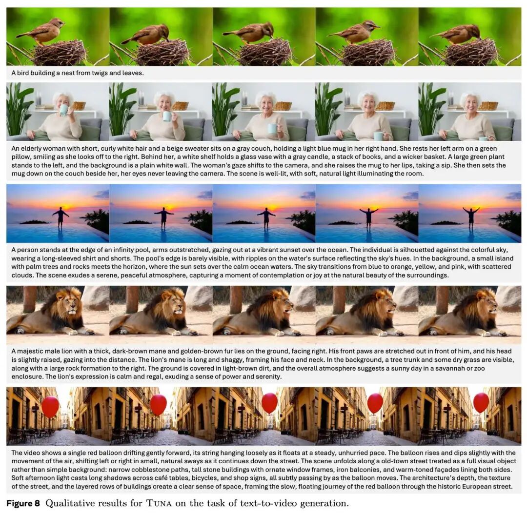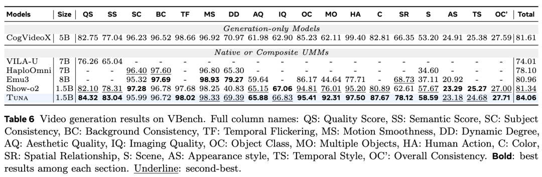 The evaluation results of video generation on VBench are shown in Table 6 below. Tuna achieves SOTA performance, surpassing all existing UMMs with video generation capabilities while using only a 1.5B parameter LLM decoder. Qualitative results, shown in Figure 8 below, demonstrate Tuna's ability to generate high-fidelity videos.