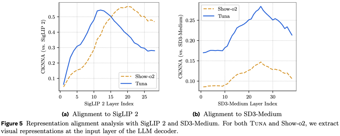 Through CKNNA score analysis (as shown in Figure 5 below), this work finds that Show-o2's features are heavily biased toward semantic understanding and show weak correlation with features from generative models. In contrast, Tuna's unified representation exhibits higher consistency with the intermediate features of SD3-Medium (a strong generative model), indicating that Tuna learns a more balanced unified representation suitable for both understanding and generation.