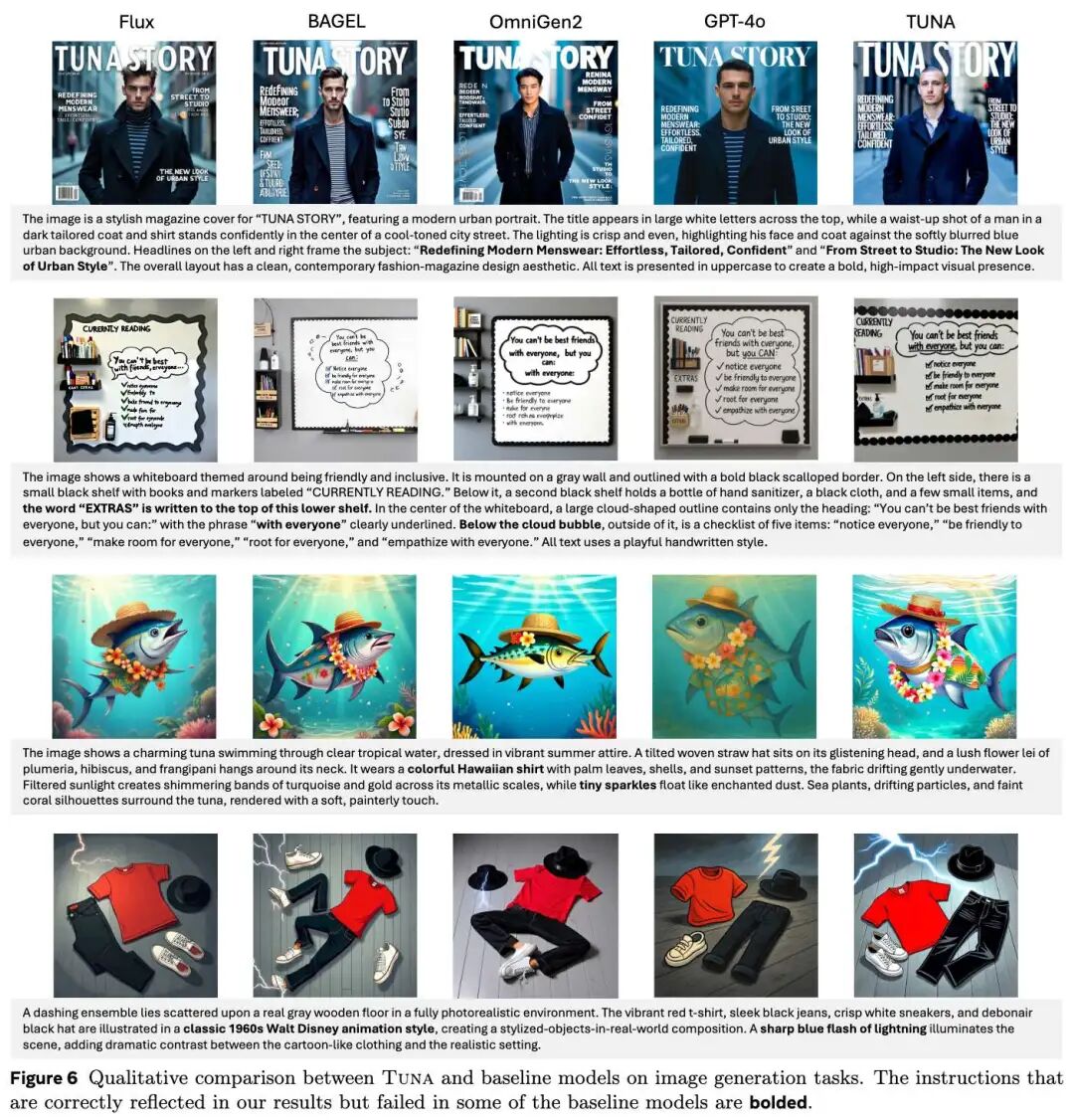 Figure 6 below demonstrates Tuna's advantages in image generation, particularly in compositional generation and text rendering (e.g., correctly spelling words and placing objects as instructed). In contrast, other models frequently make spelling errors or omit objects.