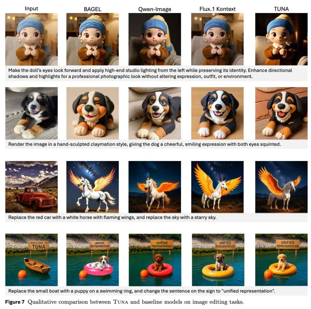 Image editing is evaluated using ImgEdit-Bench and GEdit-Bench. As shown in Table 4 below, Tuna achieves an overall score of 4.31 on ImgEdit-Bench, ranking highest among all UMMs and comparable to pure generative models like FLUX.1. On GEdit-Bench, Tuna scores the highest among all unified models. Figure 7 below displays qualitative results, showing that Tuna can accurately perform operations such as style transfer, environment changes, and object replacement.