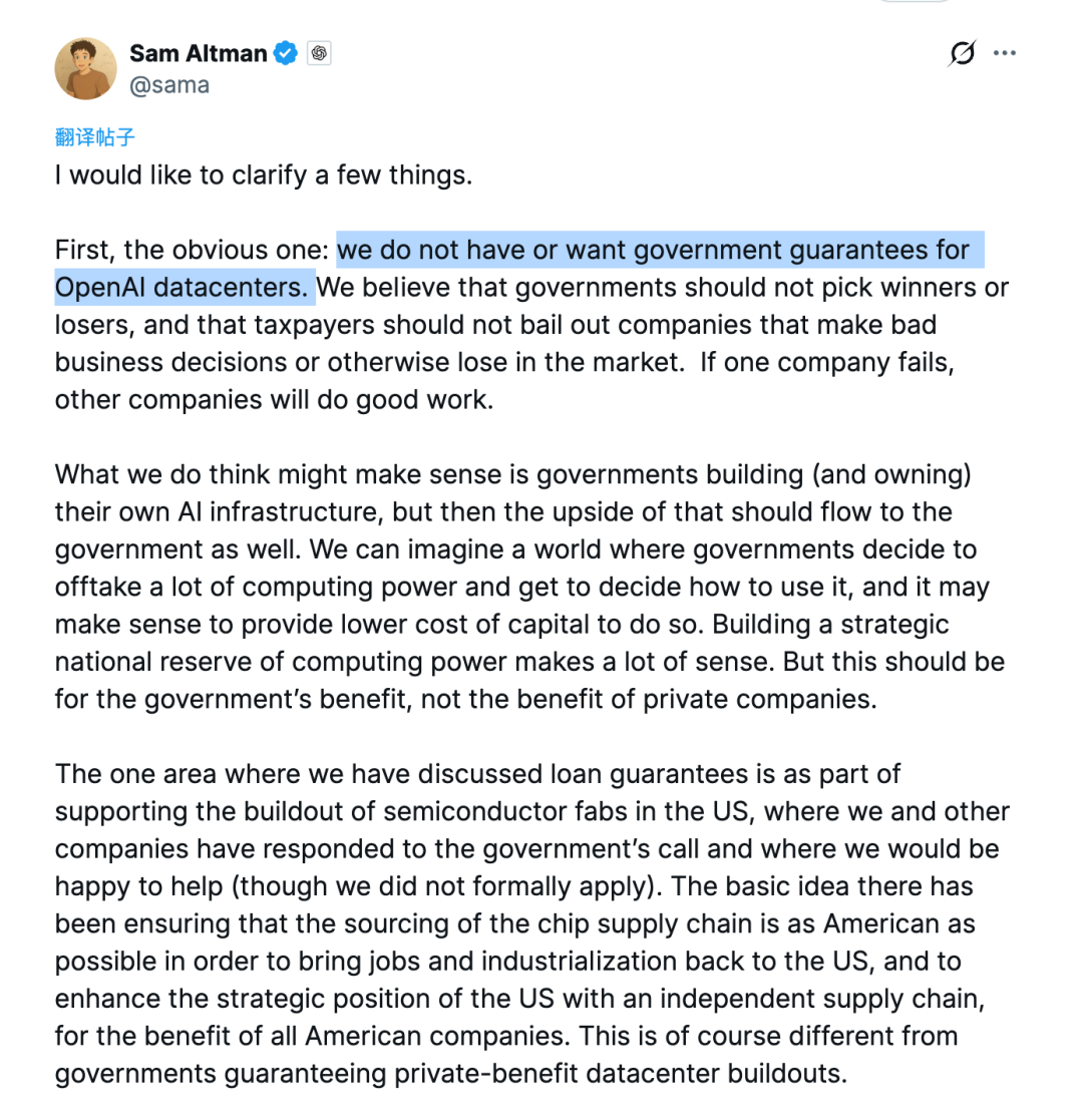 Sam Altman also released a lengthy response, stating, "We do not need nor do we want the government to provide guarantees for OpenAI's data centers." Altman said that OpenAI would rely on its own revenue growth, external investments, and future sales of computing power to support its investments.