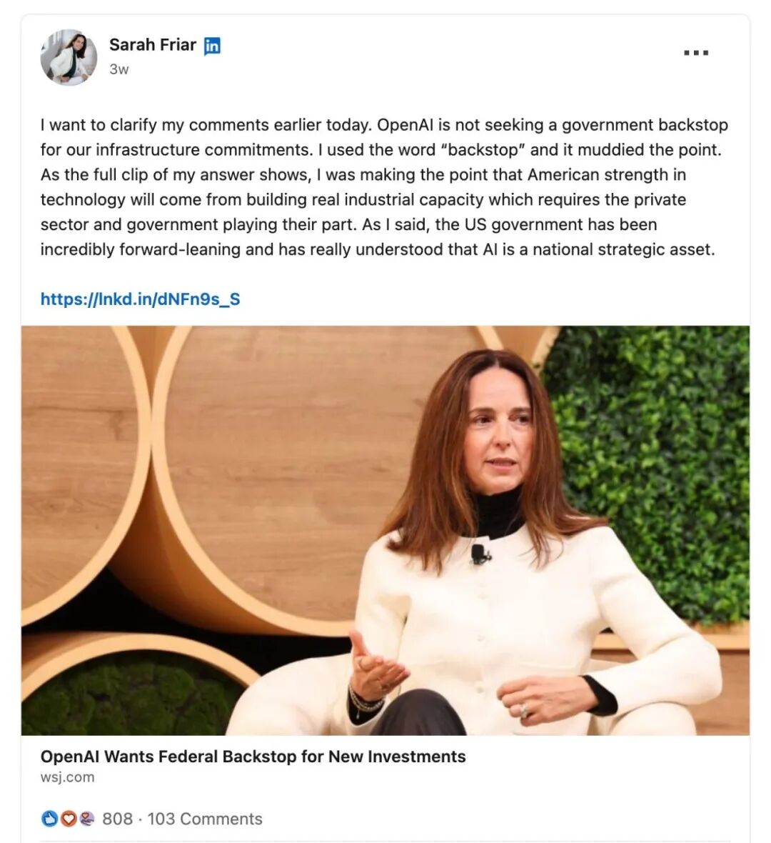 Some time ago, Sarah Friar, CFO of OpenAI, expressed support for government financial backing for AI infrastructure, sparking significant controversy in the United States. Critics accused OpenAI of attempting to have the government foot the bill for its massive AI investments. Subsequently, Friar issued a special clarification, emphasizing that OpenAI was not seeking government guarantees.