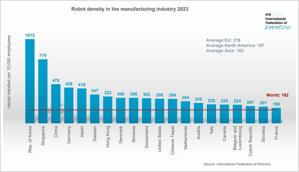 According to a previous report by the International Federation of Robotics (IFR), China has approximately 470 robots per 10,000 employees, far below South Korea's 1,012 and Singapore's 770.