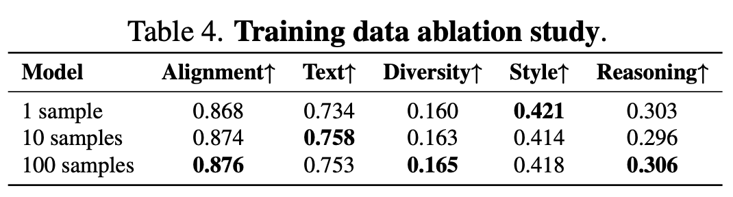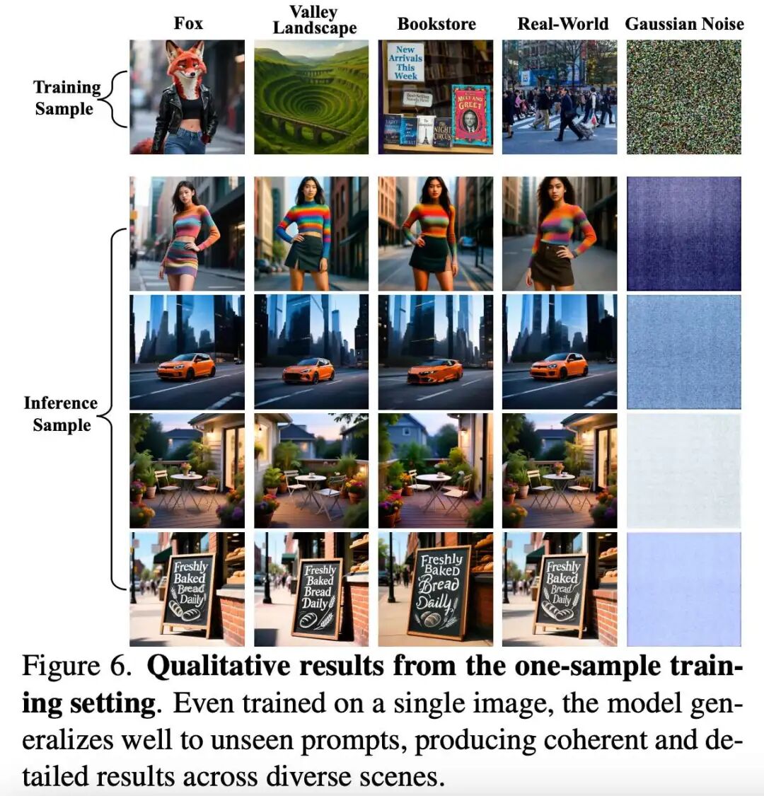 Generalization Capability: Despite training on just 1 image, the model demonstrates remarkable generalization to unseen prompts and complex scenarios (e.g., text rendering, various styles).