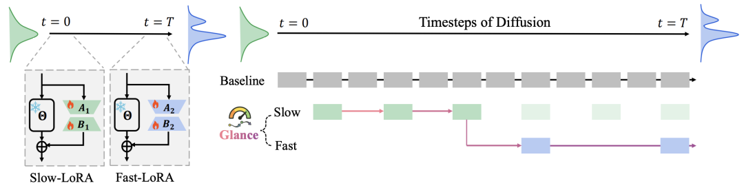 The Glance framework leverages a lightweight distillation architecture to expedite diffusion model inference through a phase-aware “slow-fast” design. Research findings indicate that LoRA adapters effectively differentiate between various stages of the denoising process, thereby efficiently capturing both global semantics and local details. The framework achieves high-quality image generation in a mere eight steps, offering a 5× speedup compared to base models. Despite utilizing only a single image and a few hours of GPU training, Glance maintains comparable visual fidelity and exhibits strong generalization capabilities when faced with unseen prompts. These results underscore that data- and compute-efficient distillation methods can preserve the expressiveness of large diffusion models without compromising quality. Glance is poised to emerge as a preferred solution for accelerating large-scale diffusion models, especially in scenarios where data is scarce.