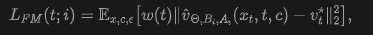 Diffusion and Flow Matching: Diffusion models learn to fit data distributions by progressively transforming noise into data through a parameterized denoising process. The flow matching formulation interprets diffusion as learning a continuous velocity field that transports samples from Gaussian noise to clean data. At time step t, the intermediate state is defined as x_t, and the model predicts the transport velocity given conditions (e.g., text embeddings) c. The objective is to minimize the mean squared error between predicted and target velocities: