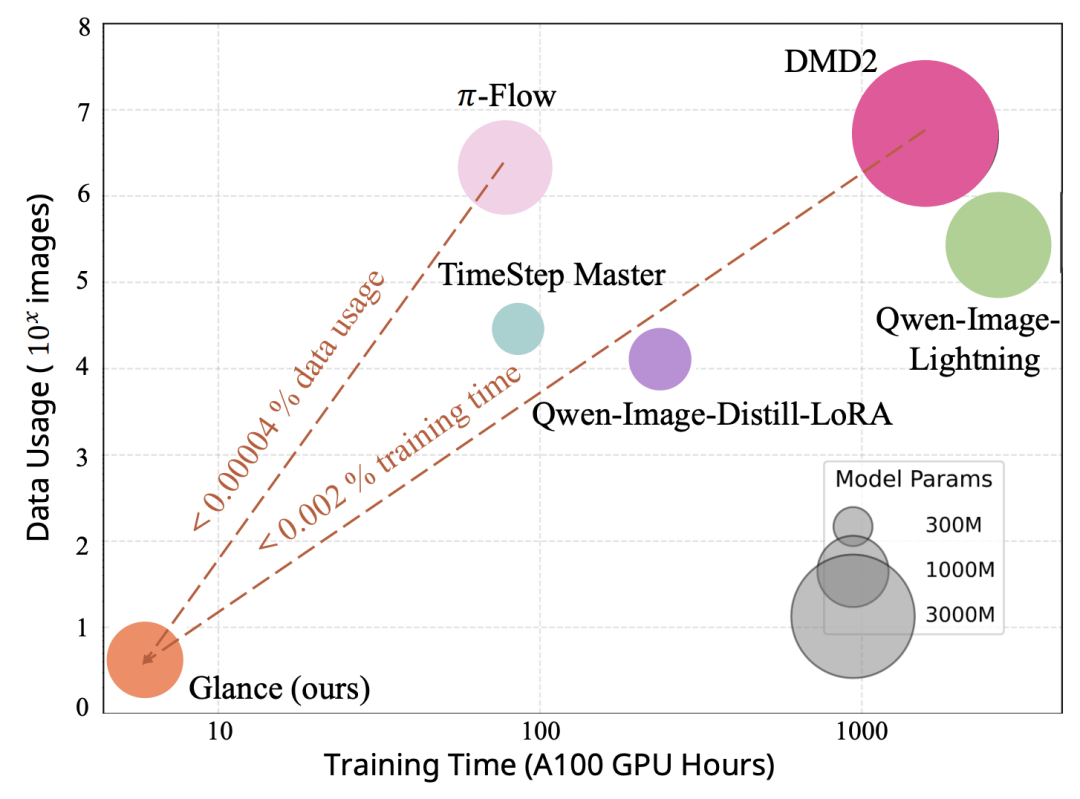 Figure 1. Comparison of data usage and training duration. Glance achieves comparable generation quality with just 1 training sample and 1 GPU hour, demonstrating extreme data and computational efficiency. Note that the x-axis uses a logarithmic scale, so zero values cannot be directly represented in the graph.