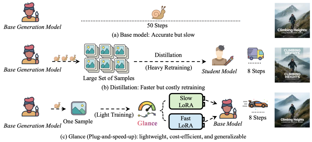 Figure 2: Comparison of distillation and acceleration strategies. Traditional distillation workflows rely on large-scale training sets and high-cost repetitive training. In contrast, Glance achieves slow and fast dual adapters with just a single sample, providing a plug-and-play acceleration solution for base generative models.