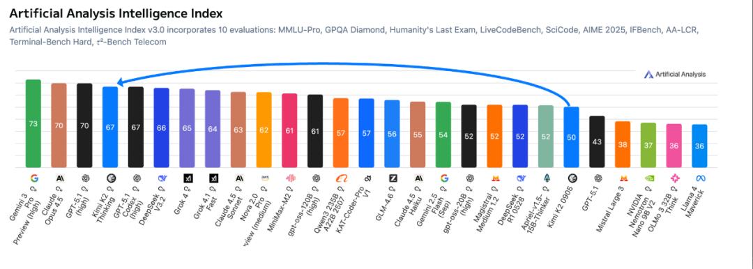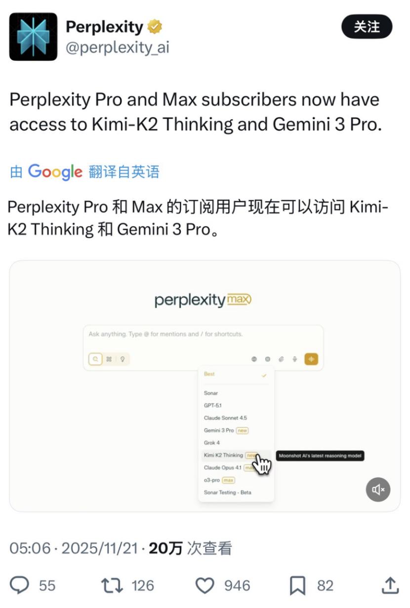 In the latter half of this year, Yuezhi'anmian released two models that solidified its position: Kimi K2 and Kimi K2 Thinking. The former, a non-thinking model, achieved State-of-the-Art (SOTA) performance among open-source models in multiple tests. The latter not only saw significant upgrades in capabilities but also became the only domestic model currently integrated with the renowned AI search engine Perplexity. Simultaneously, it was announced that Gemini3 Pro had recently topped the rankings. The previous Chinese model to receive such acclaim was the highly regarded DeepSeekR1.