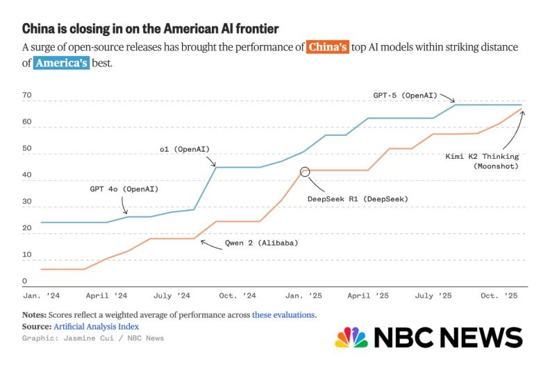 On November 30, NBC News reported that with the rise of China's open-source ecosystem, top Chinese models like Kimi K2 Thinking are approaching the performance levels of the best in the US.