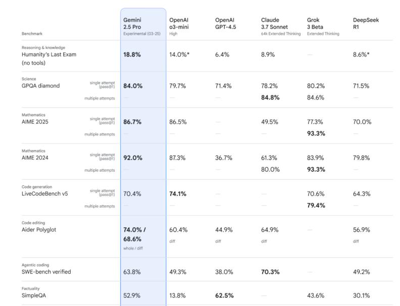 At that time, OpenAI had a habit of targeting Google by releasing its products a day before Google's new model launches. This time, Google "returned the favor" by advancing the release of Gemini 2.5 Pro to a day before OpenAI's product launch. Gemini 2.5 Pro lived up to expectations, surpassing O3-mini in multiple indicators and stepping onto the arena of the strongest models.