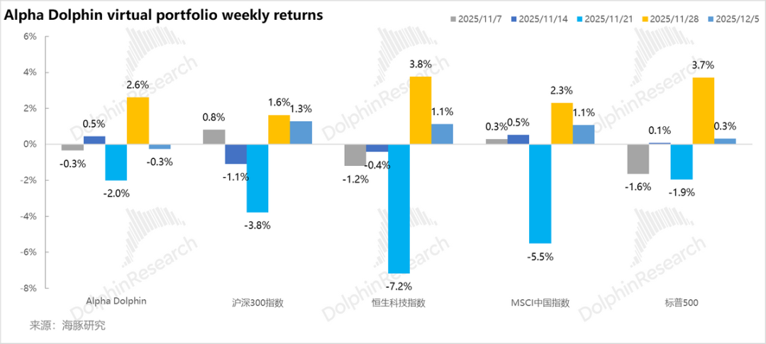 Last week, Dolphin Research's virtual portfolio, Alpha Dolphin, made no adjustments. It declined by 0.3%, underperforming the CSI 300 (+1.3%), MSCI China Index (+1.1%), Hang Seng Tech Index (+1.1%), and the S&P 500 (+0.3%).