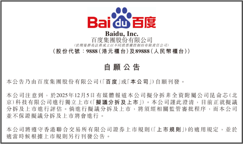 On December 7, Baidu confirmed that it is evaluating the spin-off and listing of Kunlunxin. If implemented, the move will undergo relevant regulatory approval procedures, though no guarantees have been made.