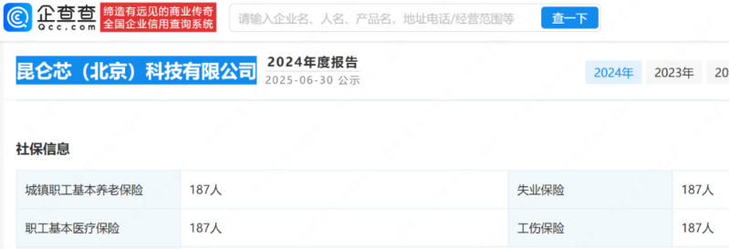 According to Qichacha, Kunlunxin was established in 2011, formerly known as Baidu's Chip and Architecture Department, with Baidu's Chief Chip R&D Architect, Ouyang Jian, serving as CEO. The 2024 annual report of Kunlunxin (Beijing) Technology Co., Ltd. reveals that it provided social security for 187 employees.