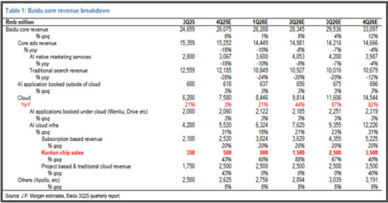 Financial data underpins corporate valuations. In a November research report, JP Morgan predicted that Kunlunxin's sales could grow sixfold to 8.3 billion yuan by 2026, significantly boosting Baidu Cloud's revenue.
