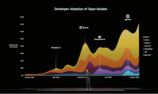 At NVIDIA's GTC Conference in October, Jensen Huang's presentation slides laid bare the reality: among open-source model downloads in 2025, Alibaba's QianWen reigned supreme, with its lead expanding at a rate of 12% per month.
