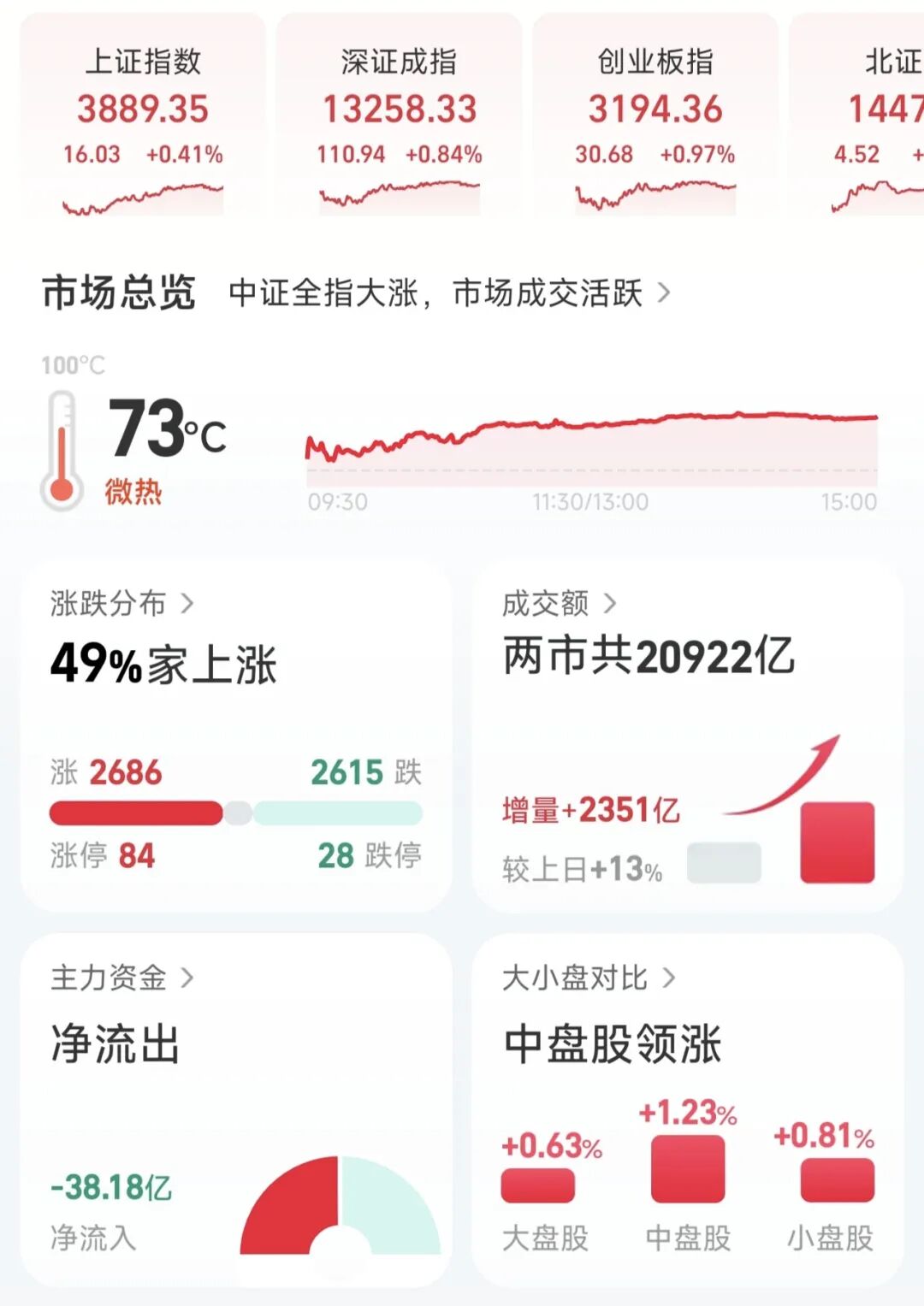 By the close of trading on Friday, activity surged on both exchanges. The Shanghai Composite Index edged up by 0.41% to 3,889.35 points, while the Shenzhen Component Index rose by 0.84% to 13,258.33 points. The ChiNext Index jumped by 0.97% to 3,194.36 points. Total trading volume across both exchanges reached 2,092.2 billion yuan, up 13% from the previous day, returning to the 2,000 billion yuan trading range and signaling active market participation.