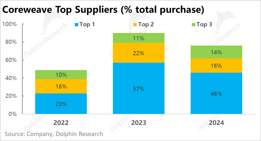 Logically, does CoreWeave excel in bargaining power with upstream suppliers? Simply put, not really. First, the fact that three suppliers account for 80-90% of the company's total procurement means that the cessation of supply from any major supplier could significantly disrupt the company's supply chain.