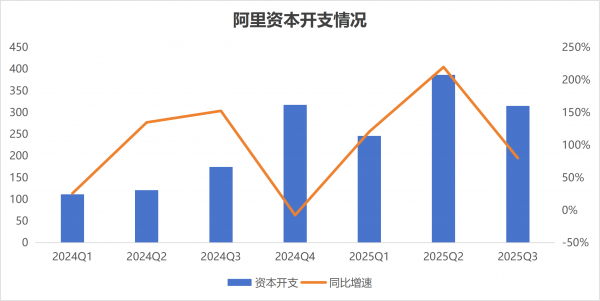 In Q3, Alibaba's capital expenditures reached 31.501 billion yuan, an 80.1% year-over-year increase. For the first three quarters of this year, Alibaba's total capital expenditures were 94.789 billion yuan, a significant 132.7% year-over-year jump.