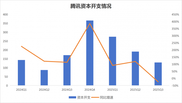 After reaching peak capital expenditure amounts and growth rates in Q4 of last year, Tencent has become more 'cautious' this year, with capital spending decreasing quarter by quarter. In Q3, capital expenditures were 12.983 billion yuan, a 24.1% year-over-year decline.
