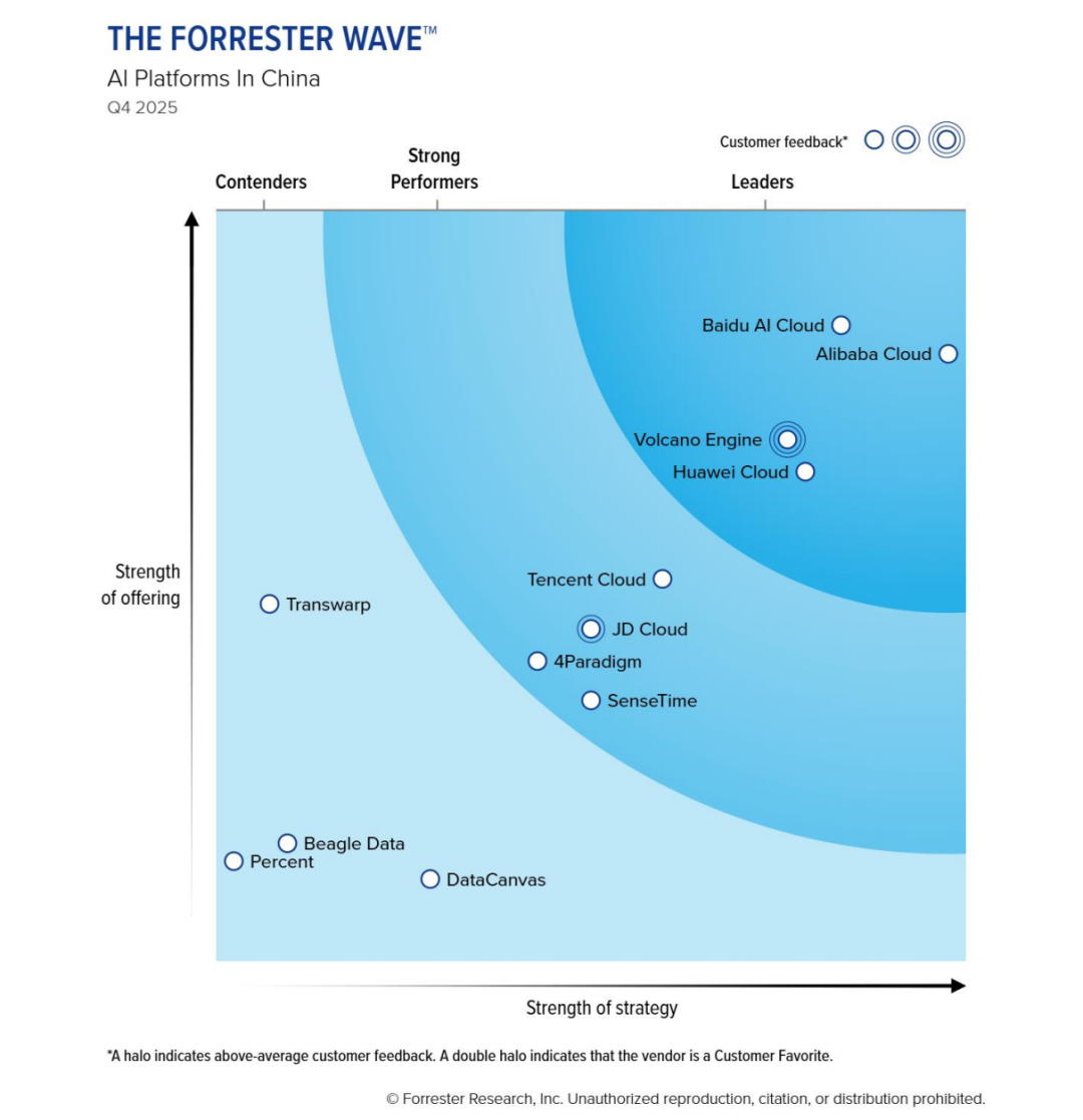 Currently, the market landscape is taking shape. Forrester's latest AI cloud report positions Baidu Intelligent Cloud as an industry leader, ranking first in product capabilities and second in strategic layout, alongside Alibaba Cloud in the TOP 2 of the leader quadrant. Among them, Baidu Intelligent Cloud, which topped the product capabilities ranking, scored full marks in 14 out of 18 product capability assessments, the highest among AI cloud providers.
