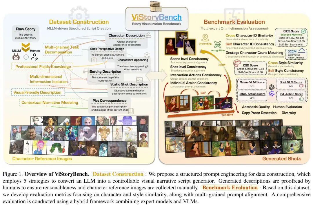 Multifaceted Dataset Creation: ViStoryBench curates 80 story segments from diverse sources, including film scripts, literary classics, and folklore. LLM-assisted summarization and script generation are manually validated. Through structured prompt engineering, LLMs are transformed into 'controllable storyboard script generators,' with scripts structured across five dimensions: