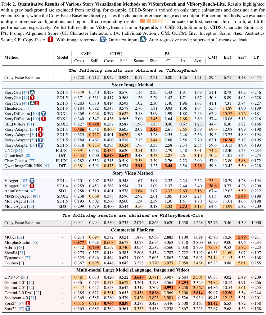 Comprehensive Assessment of 30+ Mainstream Models: The evaluation encompasses open-source image generation models (e.g., StoryDiffusion, OmniGen2), commercial closed-source models (e.g., MOKI, Doubao, MorphicStudio), multimodal large models (e.g., GPT-4o, Gemini), and video generation models (e.g., Sora2, Vlogger). This reveals the structural strengths and weaknesses inherent in different technical approaches.