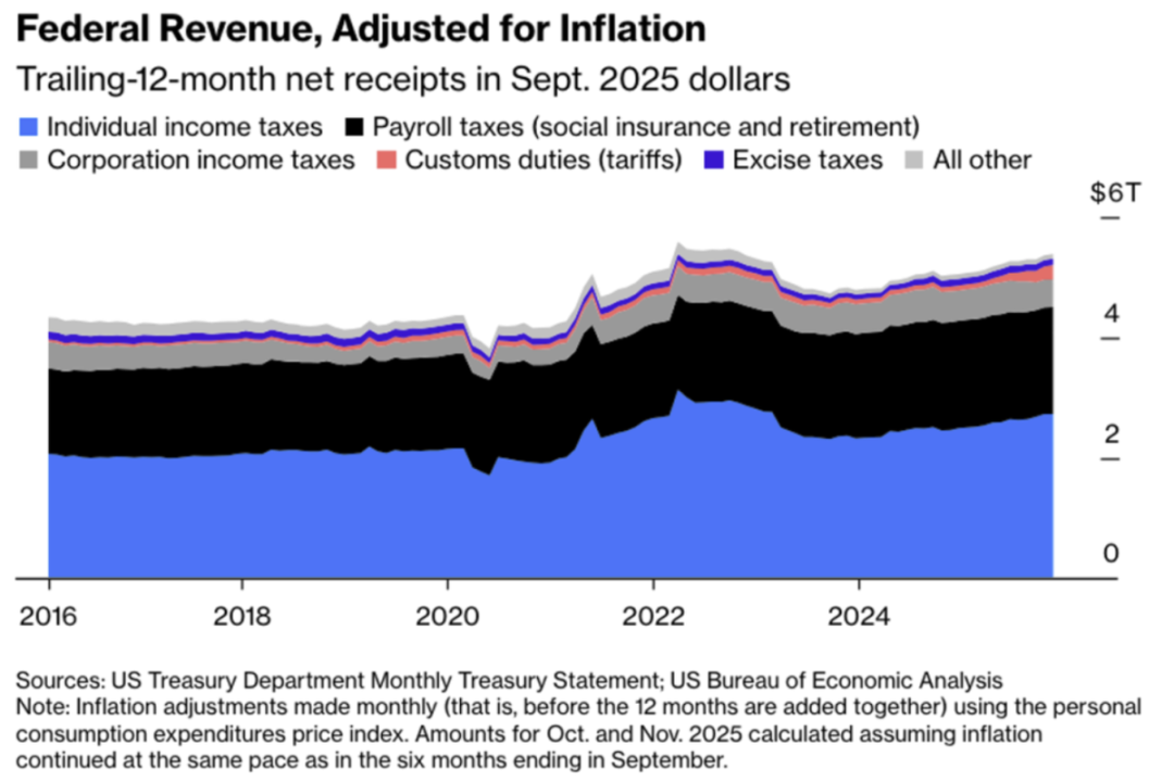 U.S. fiscal data reveals that household asset gains outpace wage growth: personal income tax revenue rose 26% from pre-pandemic levels, while payroll tax revenue grew just 14%, indicating capital gains significantly outpaced wage growth.