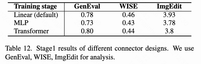 Connector Design: As shown in Table 12 below, the linear layer connector outperforms MLP or Transformer connectors.