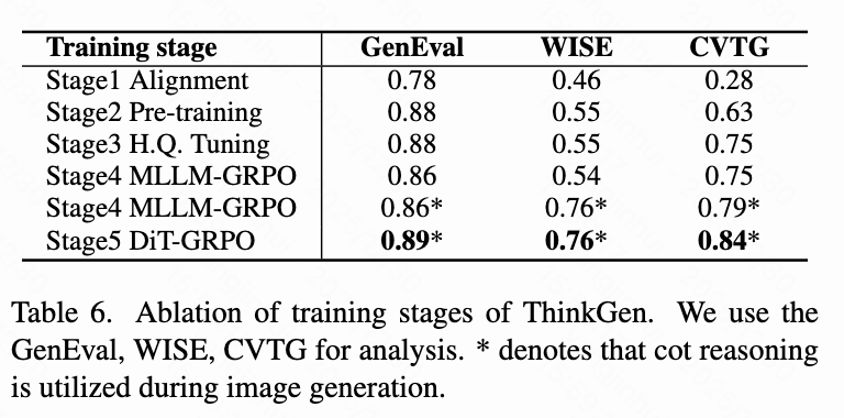 Training Stage Ablation: As shown in Table 6 below, the gradual application of each training stage contributes to the performance of ThinkGen.