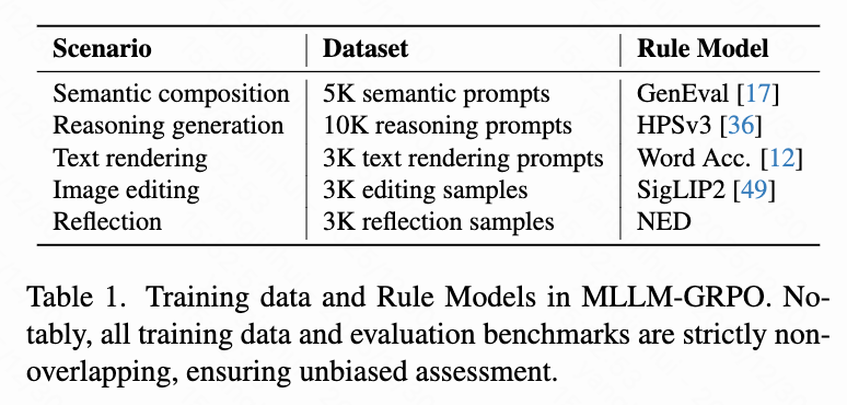 Stage 4 MLLM-GRPO: In this stage, GRPO is applied to the MLLM to encourage the generation of rewritten text aligned with the DiT's preferences. The MLLM is optimized across multiple scenarios to enhance the generalization capabilities of CoT reasoning. Five representative generative scenarios are selected: semantic composition, reasoning generation, text rendering, image editing, and reflection. As shown in Table 1 below, for each scenario, dedicated datasets are collected and curated, and corresponding rule-based models are designed to guide optimization.