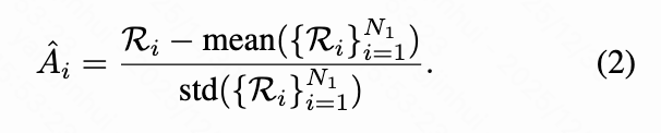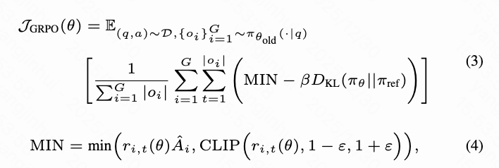 The policy is then updated by optimizing the GRPO objective, which is a clipped surrogate function regularized with KL divergence: